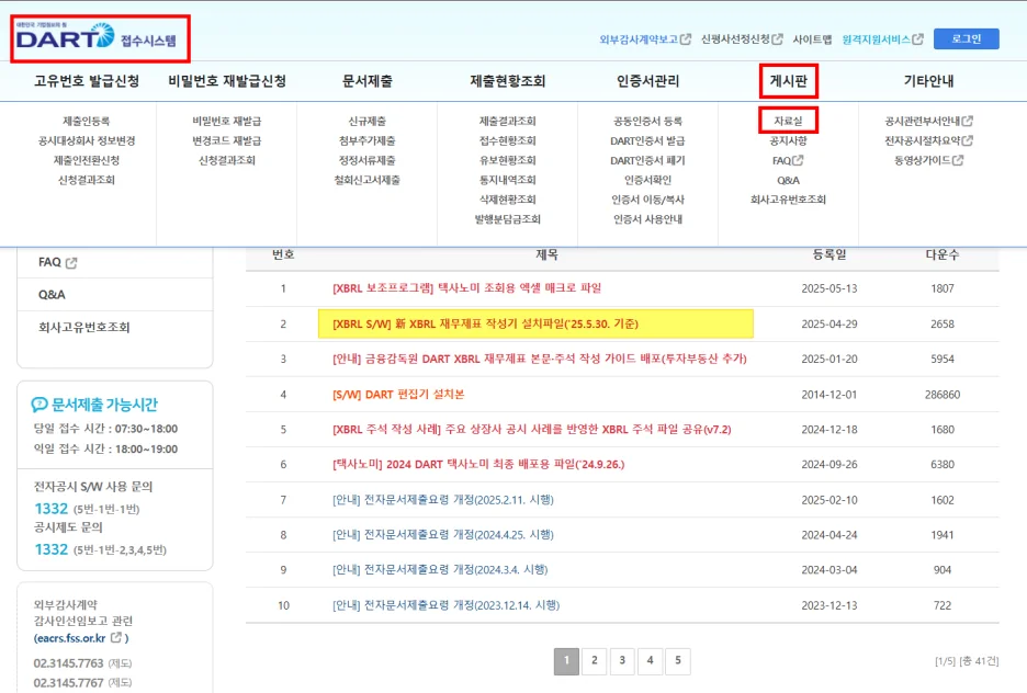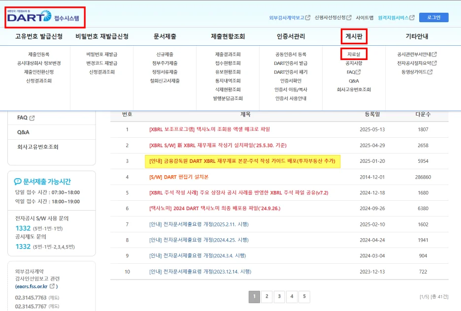 금융감독원 DART 접수 시스템 - 게시판 - 자료실(클릭)