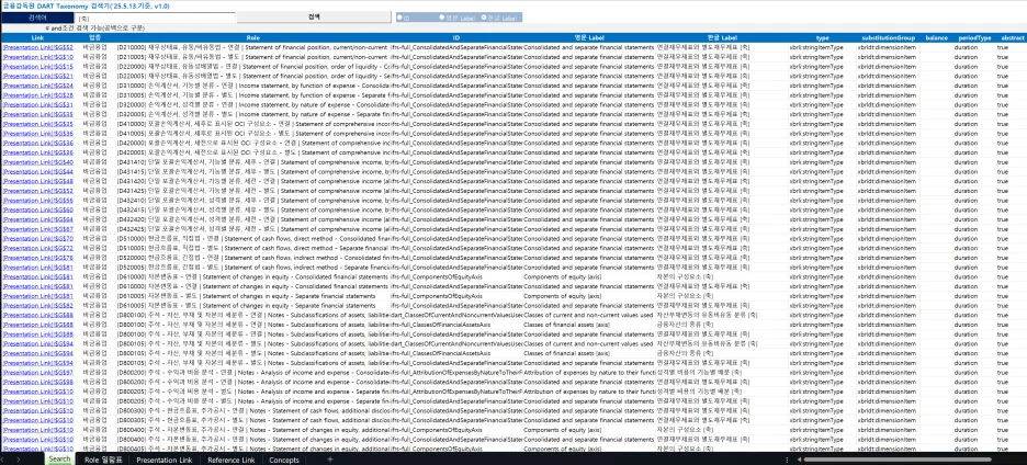 이 파일에서는 DART 택사노미의 국문, 영문 Lable과 ID로 요소(Element)를 검색하고, 각 요소의 속성 정보를 한 번에 조회할 수 있습니다.
