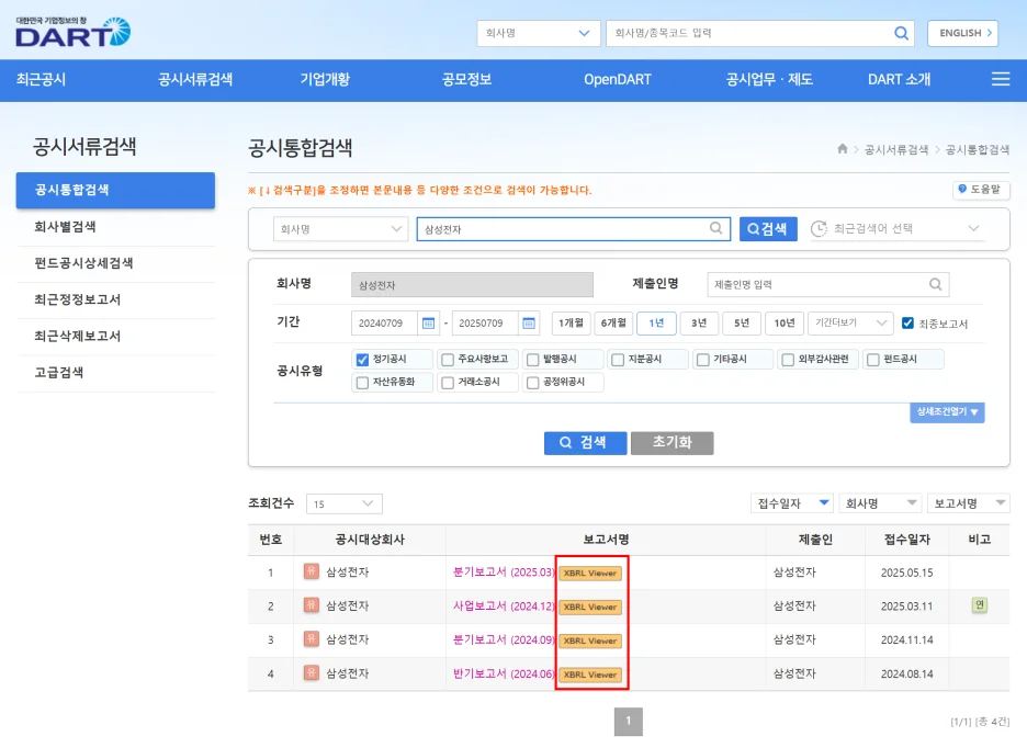 조회 방법은 똑같지만, XBRL로 공시된 보고서에는 오렌지색 'XBRL Viewer' 버튼이 함께 표시됩니다.